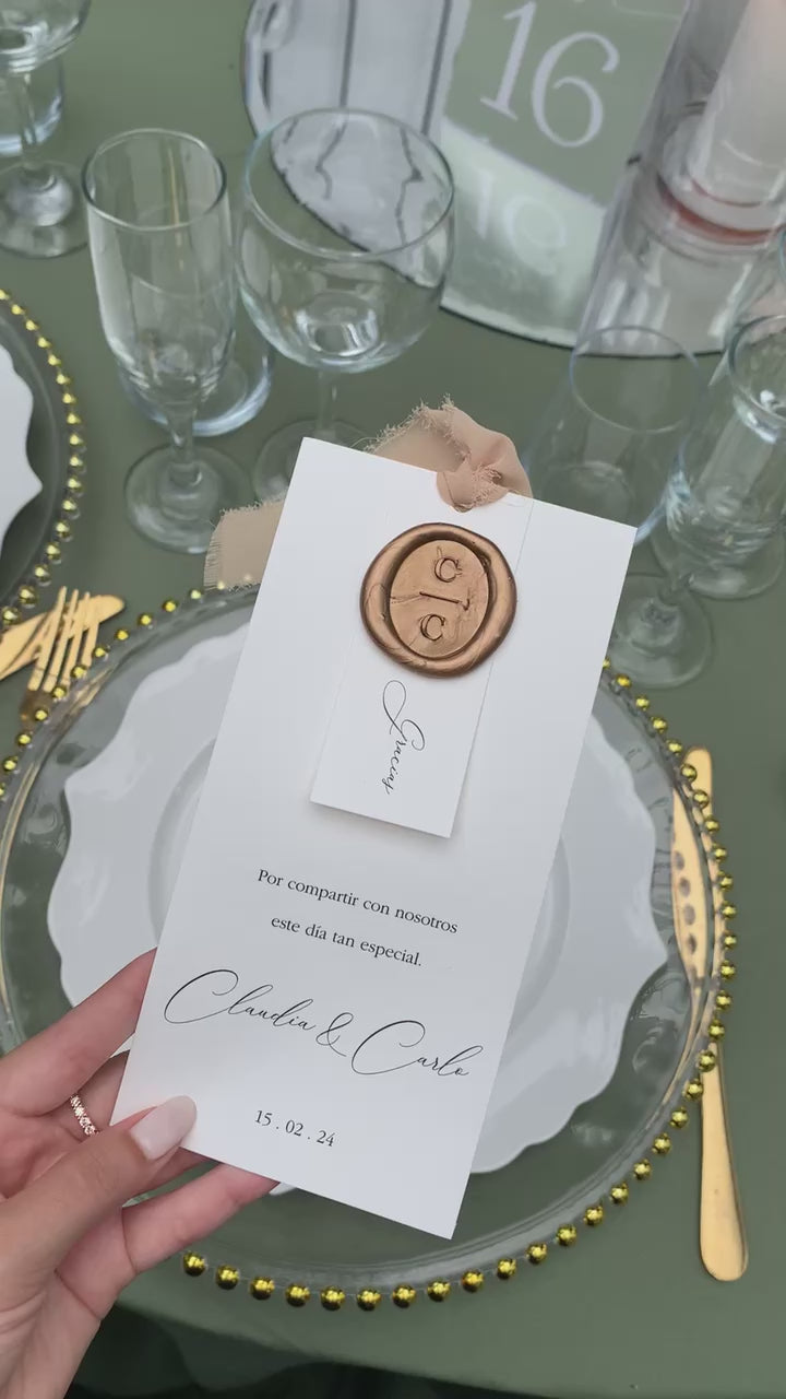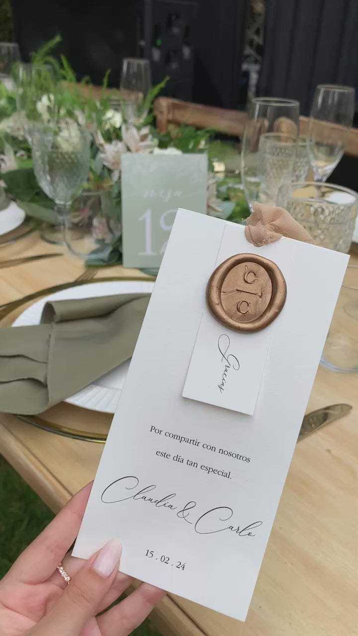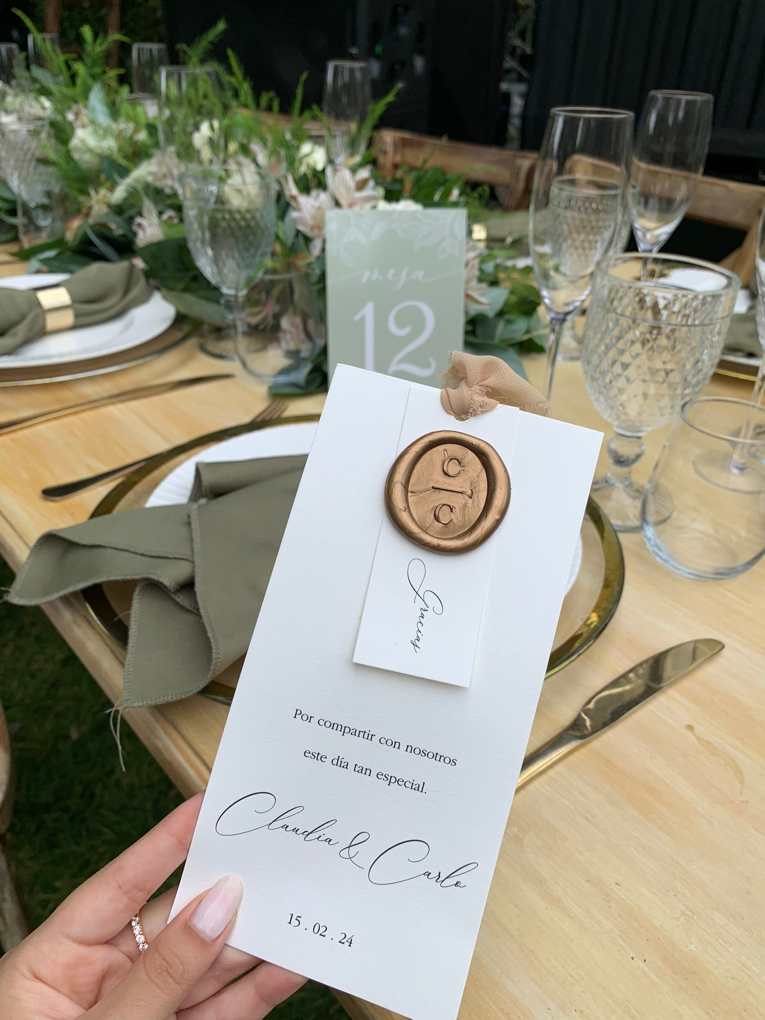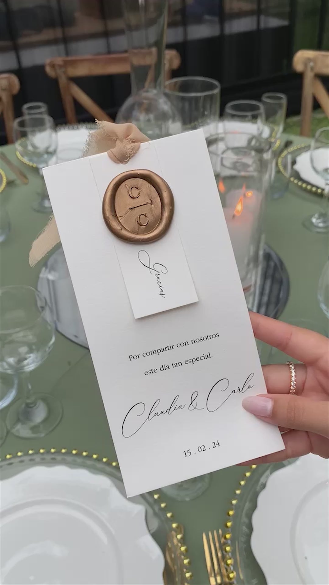 Nuestras tarjetas de agradecimiento con sello de lacre (9x18 cm) están elaboradas en cartulina premium y llevan un acabado artesanal que marca la diferencia: